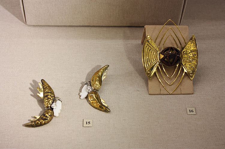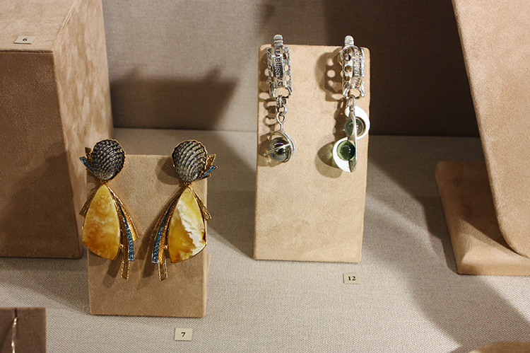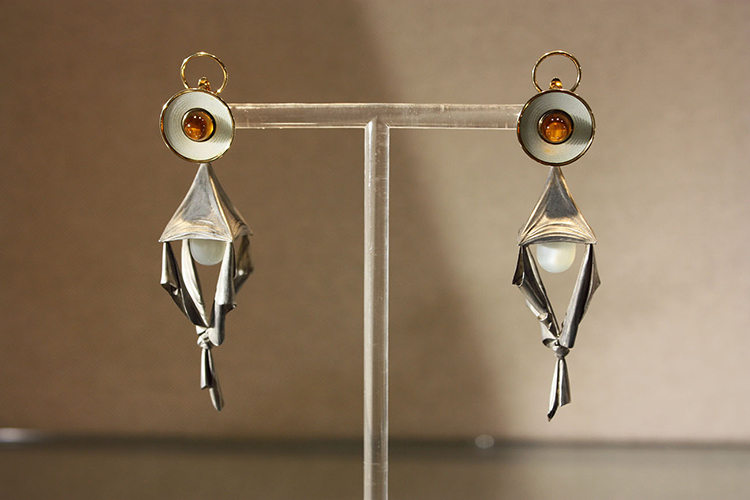 Андрей Назаров, Москва. 1) Брошь «Лети домой», 2025; 2) Серьги «Душа», 2021